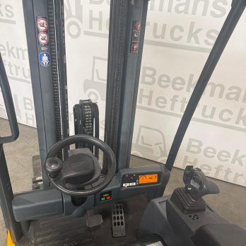 Deze heftruck is uitgerust met side shift, armsteun met joystick, non-marking banden, volrubber banden, blue spot, verlichting voor, free-lift, auto-fill en voorbereiding voor 4e functie.