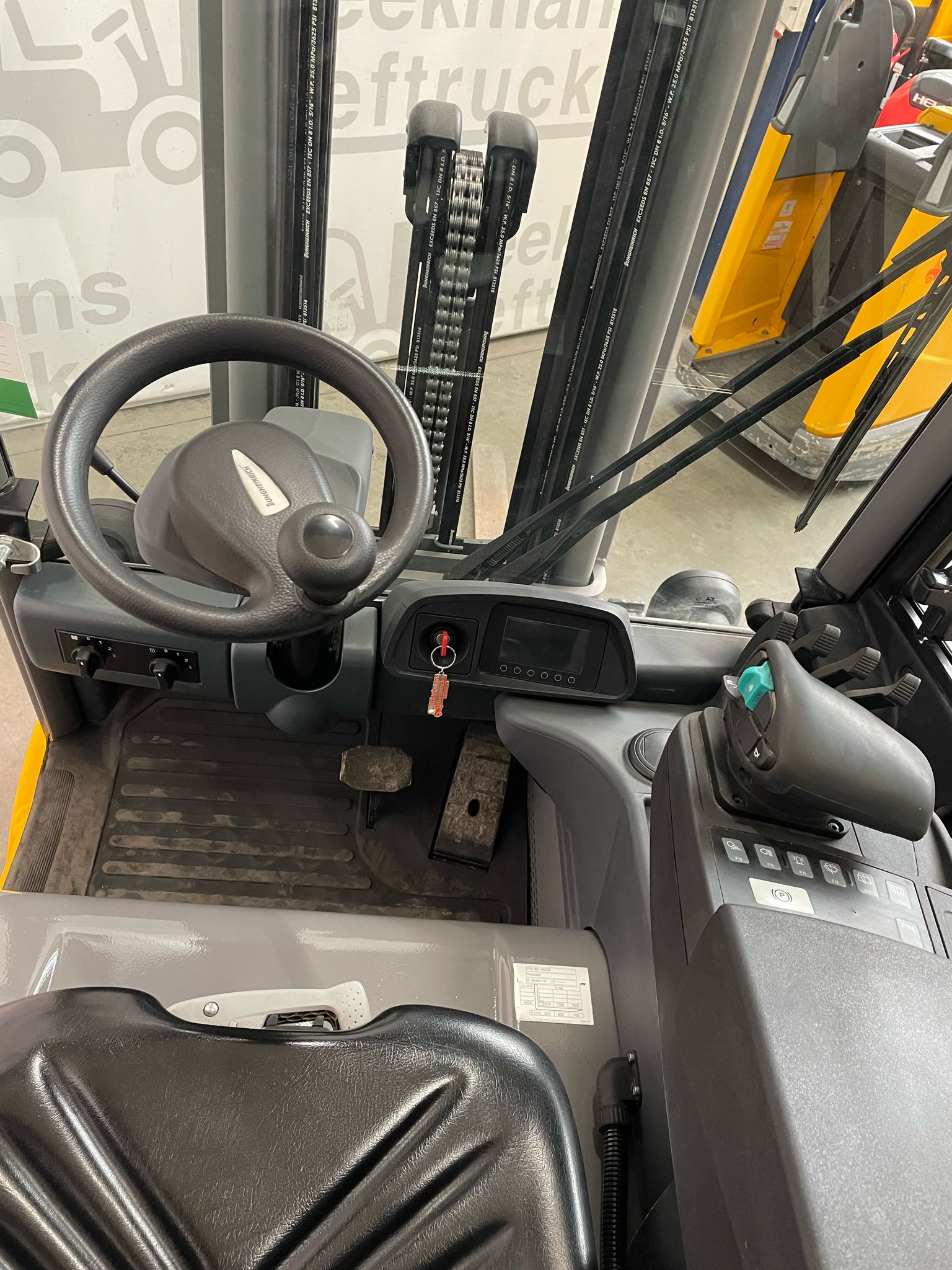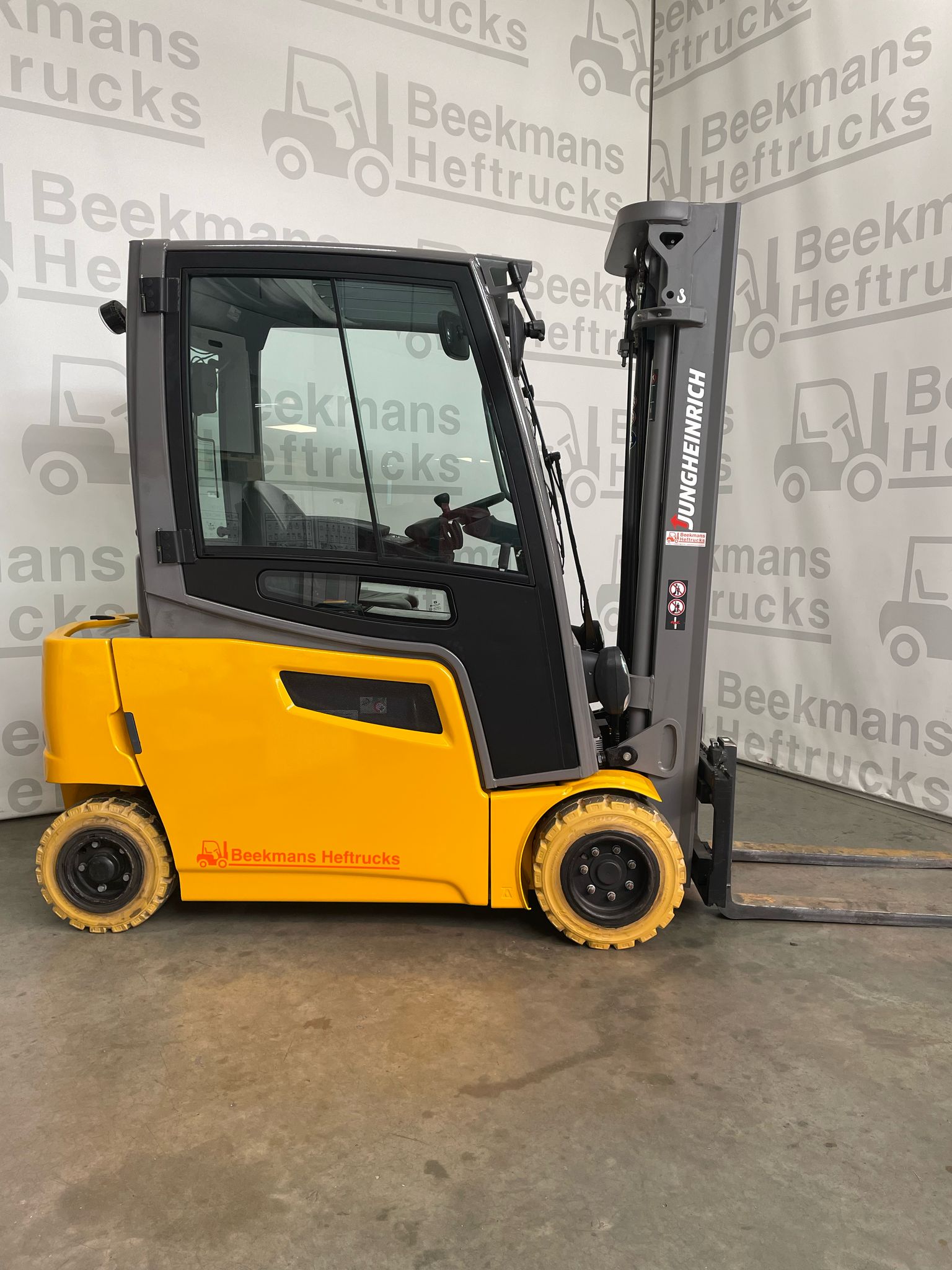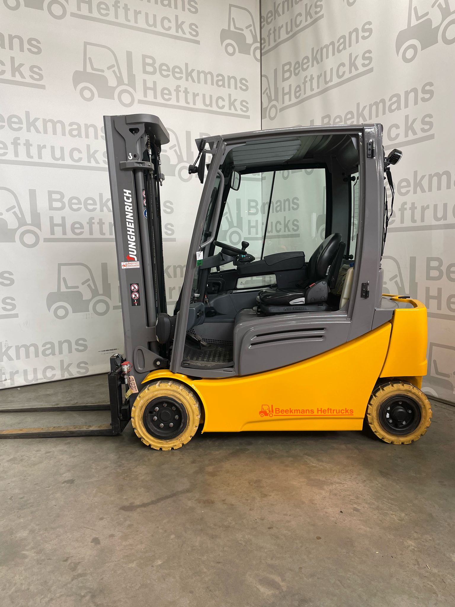 De Jungheinrich EFG320 is een elektrische heftruck van het bouwjaar 2017 met een capaciteit van 2000 kg en een hefhoogte van 4800 mm. Deze gebruikte heftruck is uitgerust met een halve cabine, armsteun met mini-lever bediening, non-marking banden, vol rubber banden en verlichting aan zowel de voor- als achterzijde. Extra functies zoals een Red Spot, Auto-fill systeem en Free-lift maken deze heftruck veelzijdig inzetbaar.