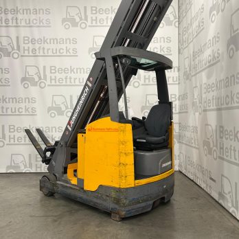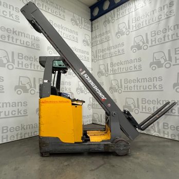 De Jungheinrich ETV325 uit 2016 is een krachtige gebruikte reachtruck van Beekmans Heftrucks, ontworpen voor intensieve magazijntoepassingen met zware lasten. Deze reachtruck heeft een indrukwekkende hefhoogte van 10.700 mm en een capaciteit van 2500 kg, ideaal voor hoge stellingen en smalle gangen.